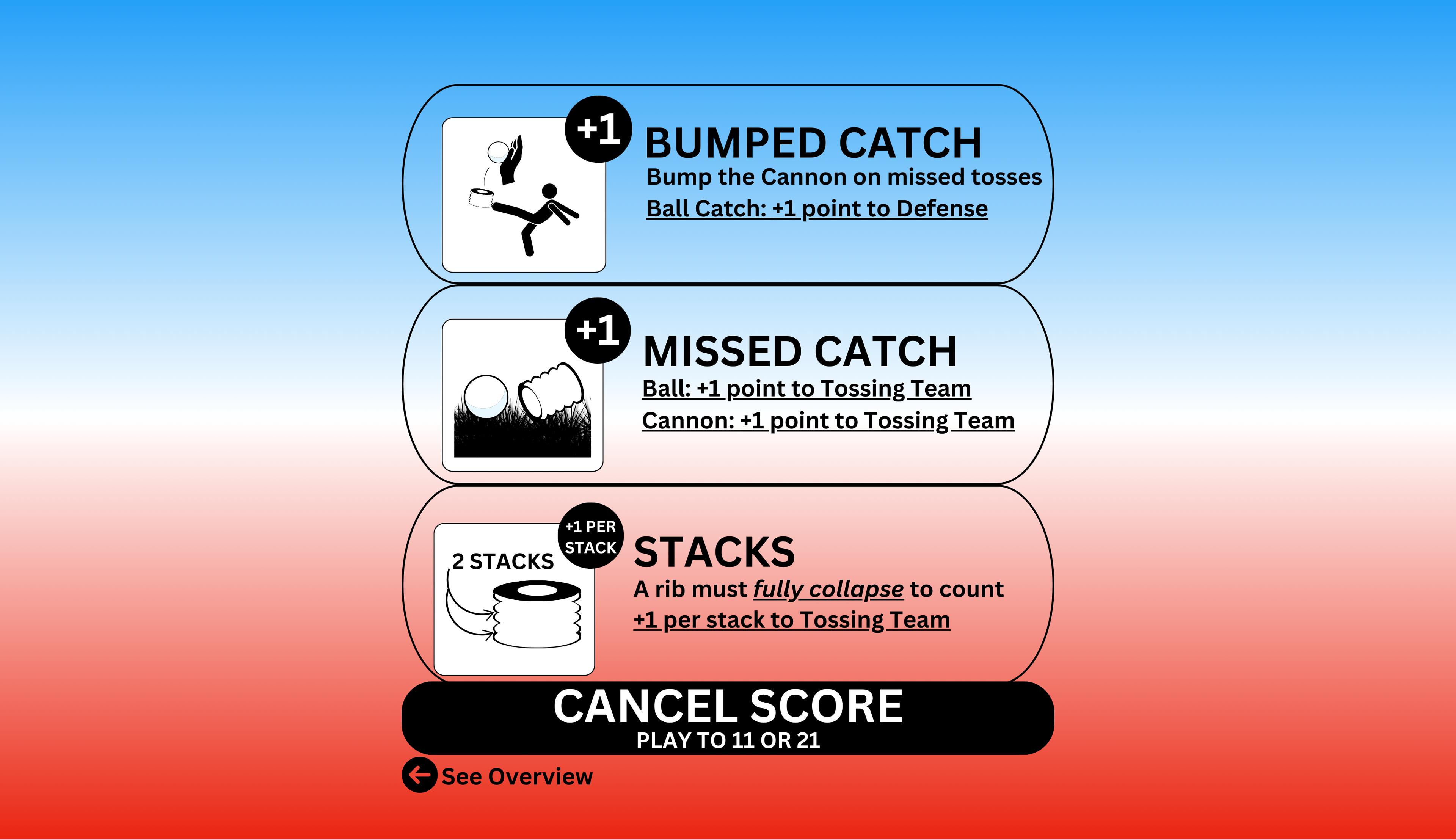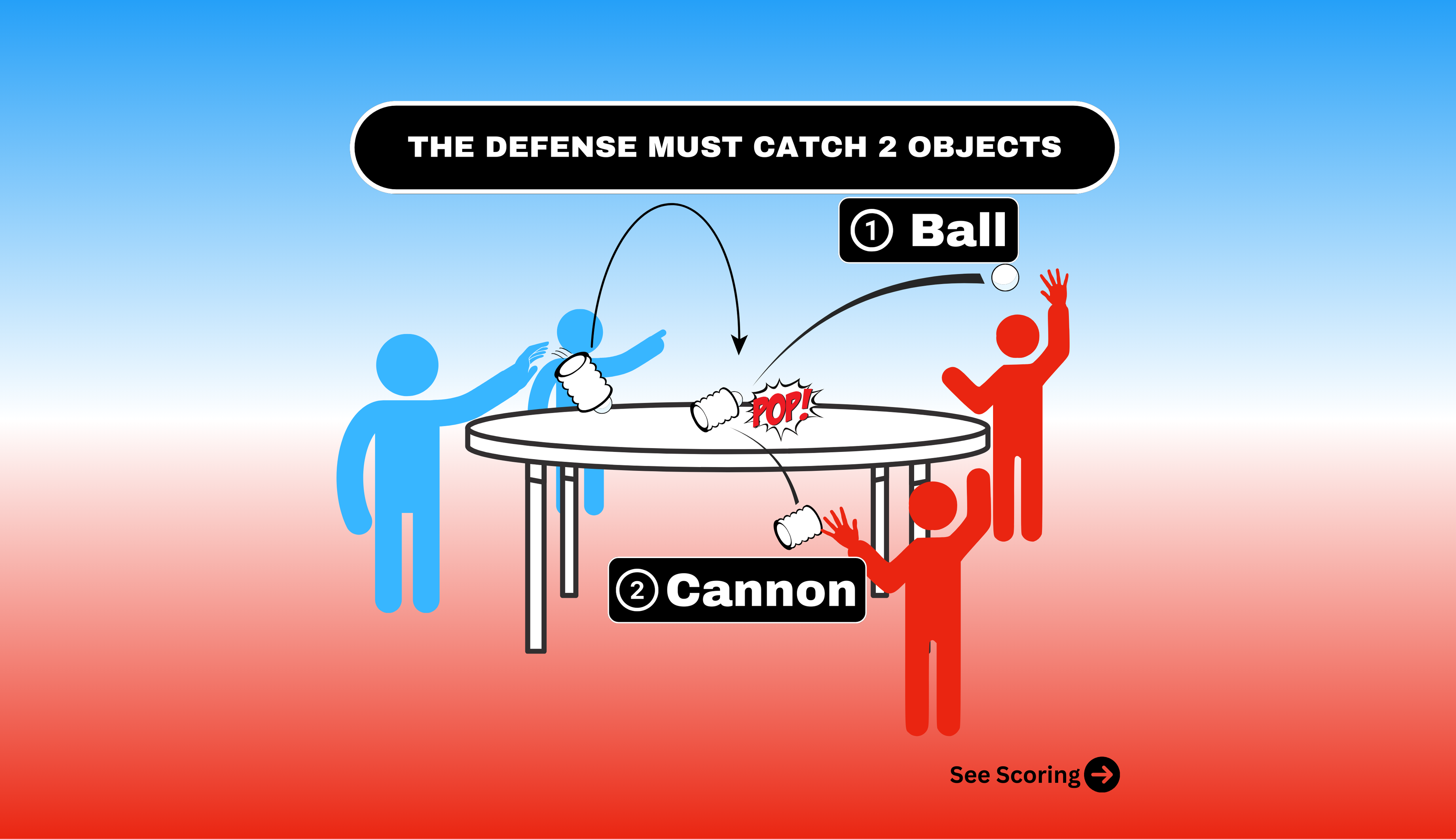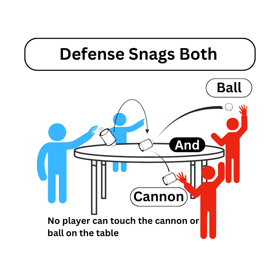 - If the toss misses the table, the defense can bump the cannon one time to pop the ball out and catch for a point.
